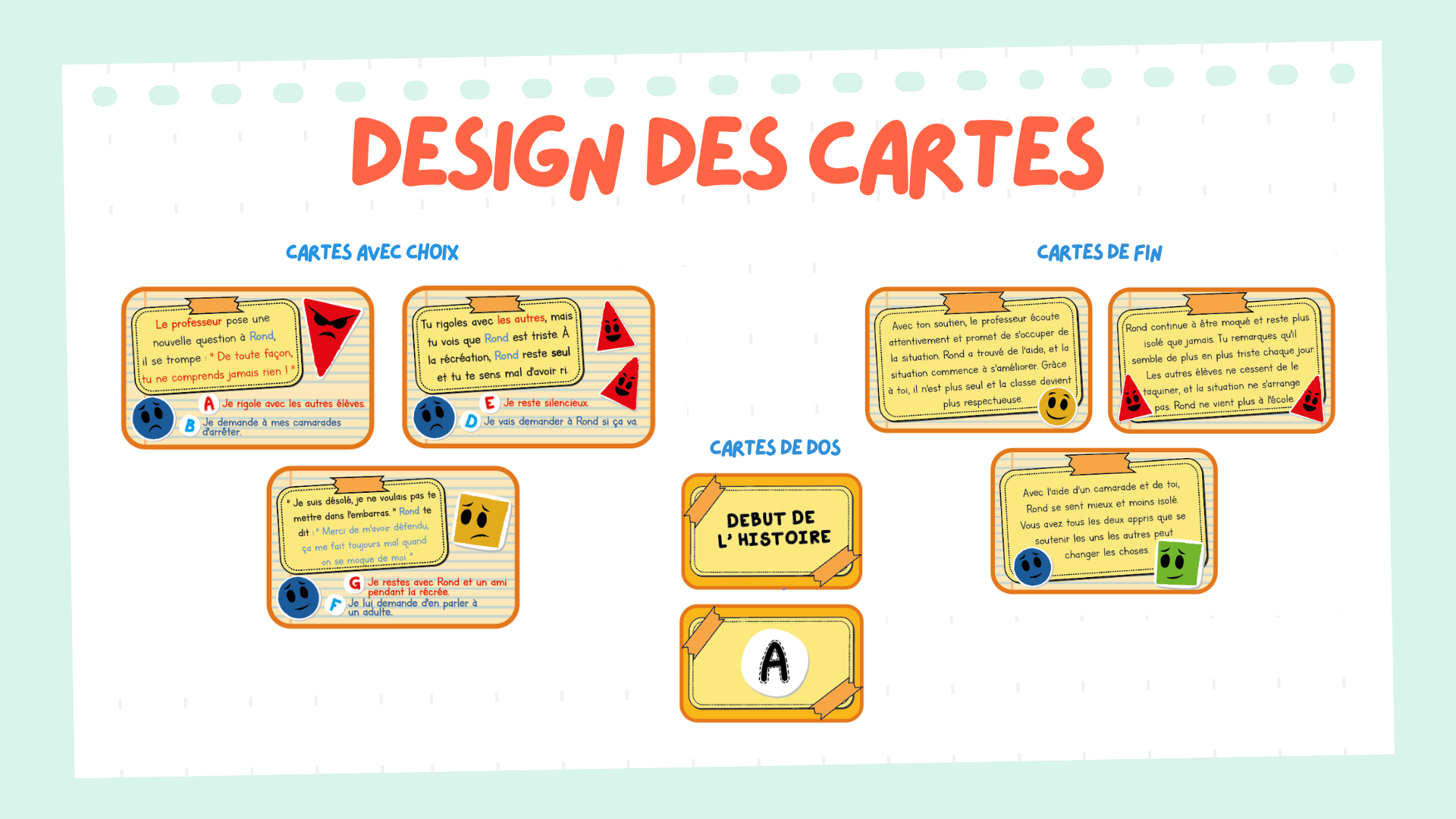 Pitch Serious game narratif où le joueur avance à travers un parcours de cartes en incarnant des formes simples. Par ses choix, il influence l’histoire et accède à l’une des trois fins possibles. Pensé pour un public scolaire, le jeu sensibilise aux mécanismes du harcèlement et à l’importance d’agir.