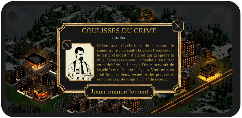Lors de ma 2ᵉ année à l'école Brassart, j’ai participé à un workshop d’un mois dont l’objectif était de concevoir et réaliser un jeu mobile sous Unity. Le thème imposé était Les Incorruptibles, ce qui nous invitait à revisiter la prohibition et l’univers policier des années 1930 en y apportant notre propre interprétation. Nous étions une équipe de quatre étudiants, chacun chargé de responsabilités spécifiques allant du game design à la programmation en passant par l'art et la narration.
